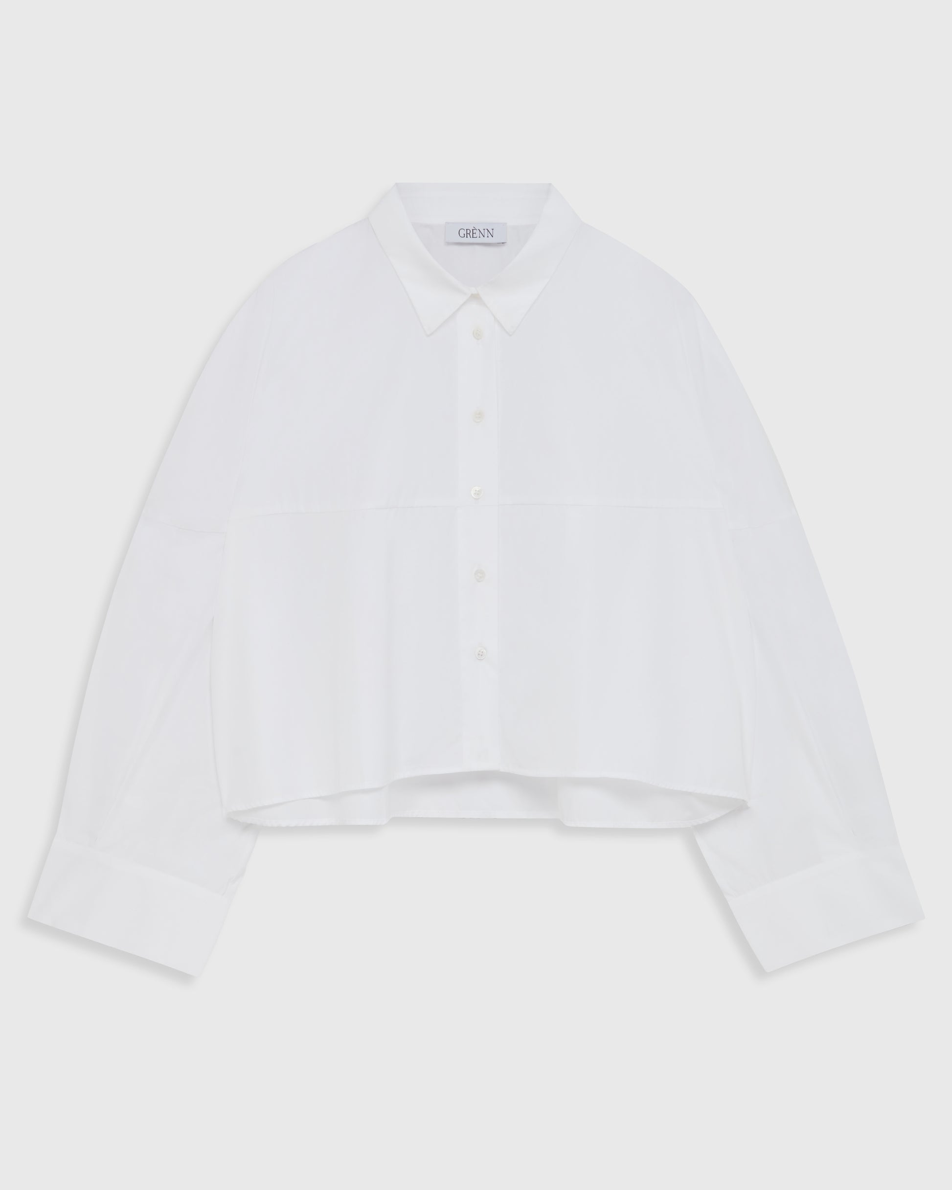 Crisp white poplin in an oversized, cropped silhouette. Made from deadstock fabric sourced from a French luxury house. Clean lines, structured drape, effortless shape.